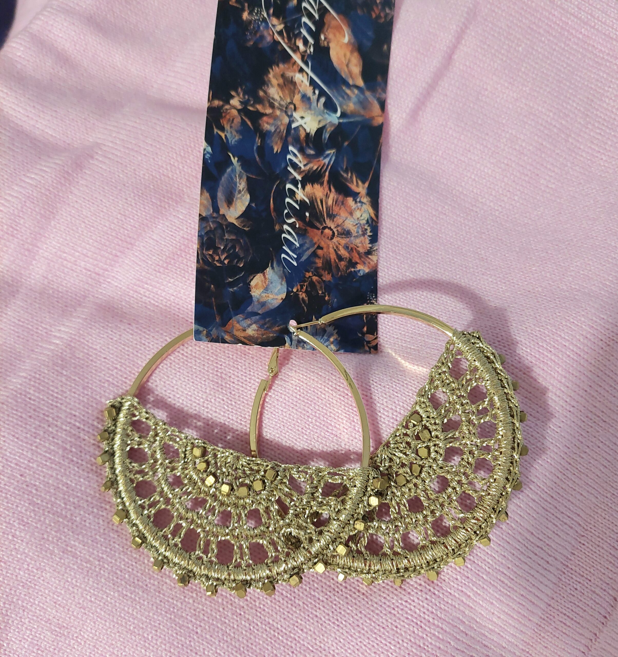 Upeat korvakorut, kullattu rengaskorvakoru, käsintehdyt Nepalissa. Korun osa on käsin virkattu.